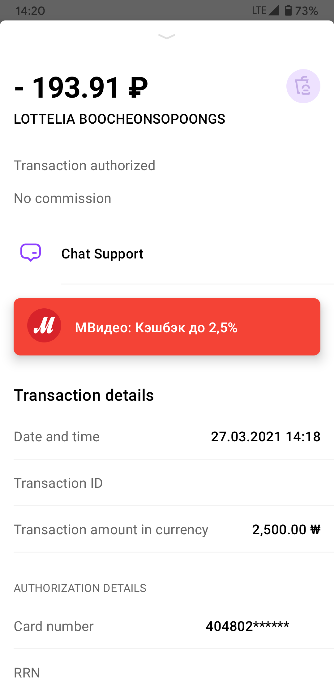 영수증엔 마찬가지로 해외VISA로 나오고, 카드의 BIN은 실물카드와 다르게 나옵니다.