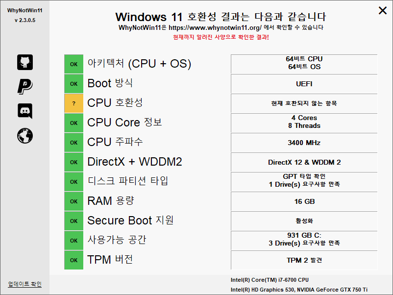 설치가 가능한지는 'PC 상태 검사' 프로그램으로 확인이 가능한데, 이게 뭐가 문제인지 자세히 알려주질 않습니다.