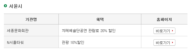여기서 제가 써먹을 만한 혜택은 지자체 문화시설 무료입장/최대 50% 할인이네요.