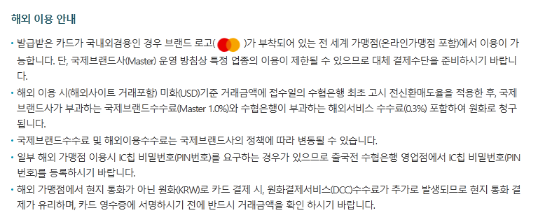 해외 결제를 하는 사람이 얼마나 있을지는 모르겠지만 이건 의외로 $0.5씩 받아가는 카드사들에 비해 0.3%면 해외 결제용으로는 무난해 보입니다.