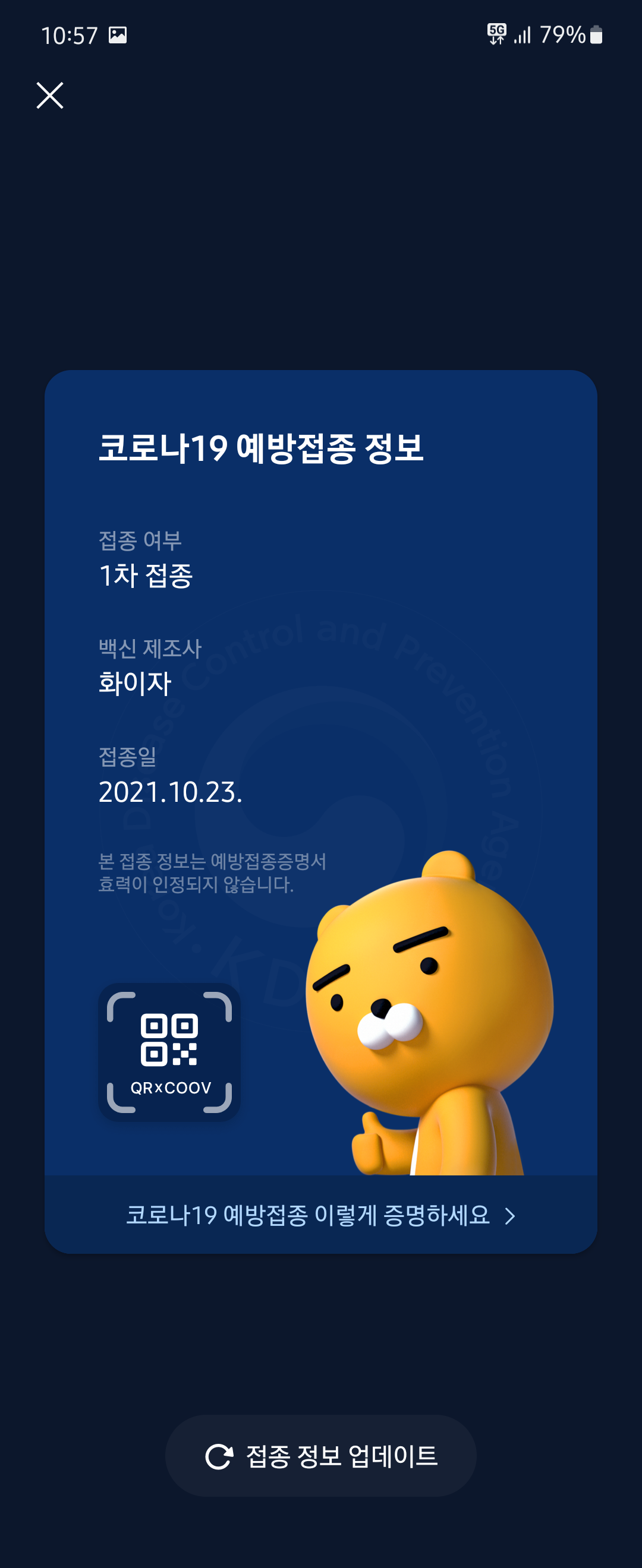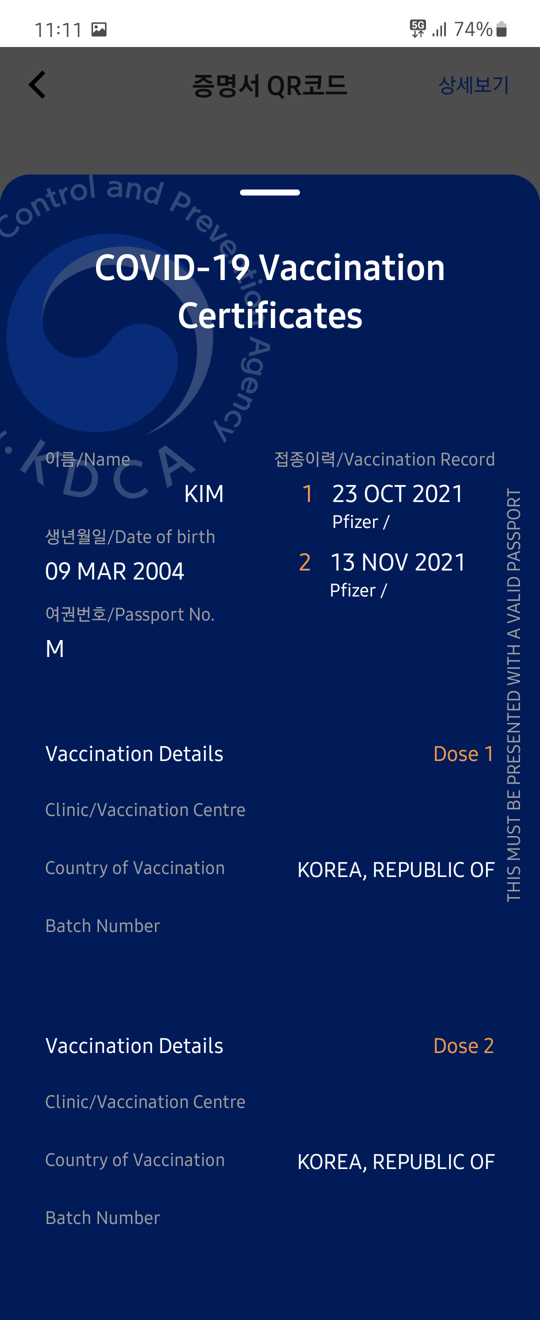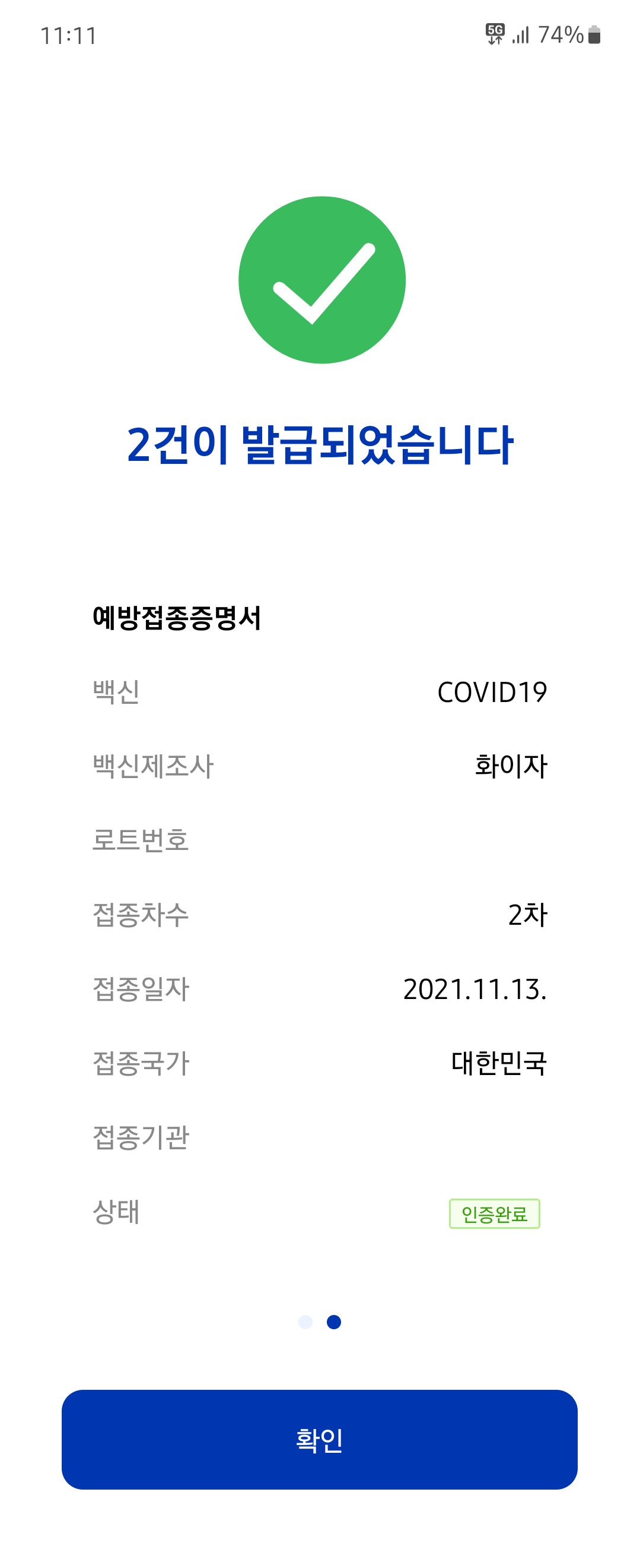 증명서를 보니 14일도 안 지났는데 벌써 접종완료가 붙어있네요