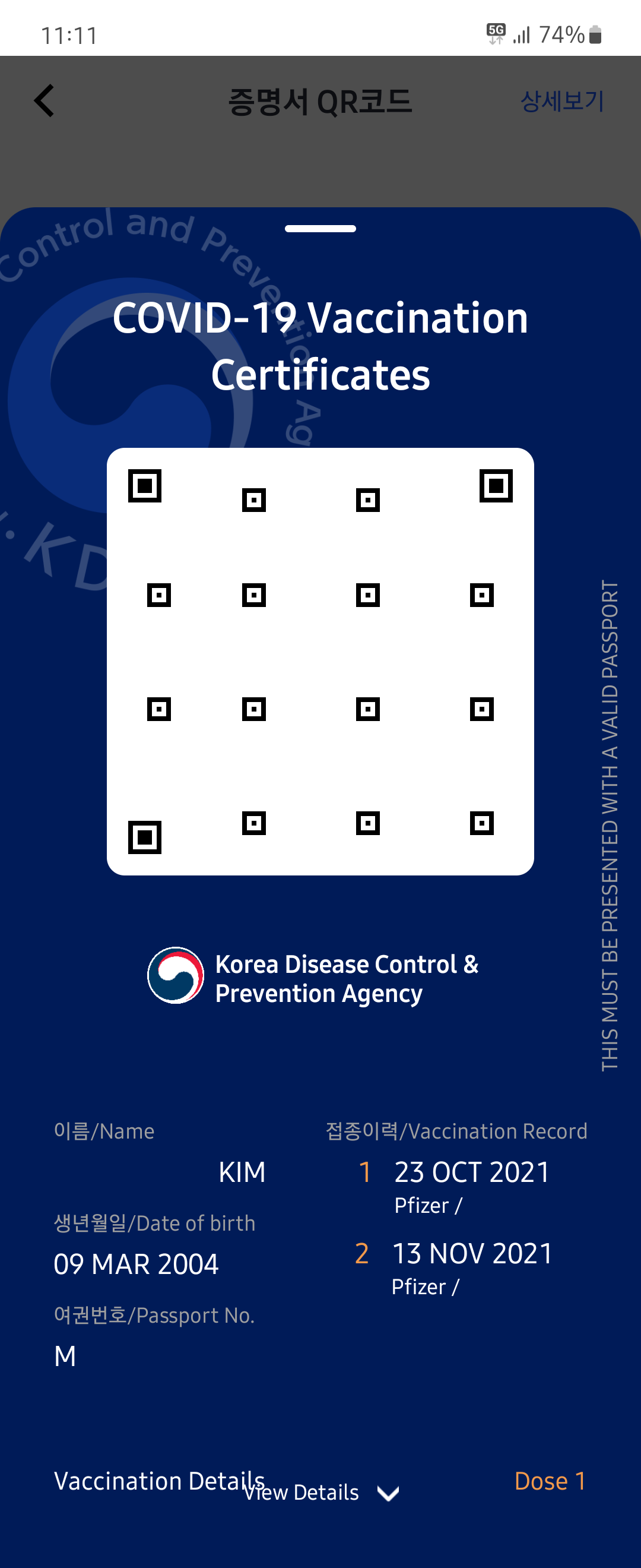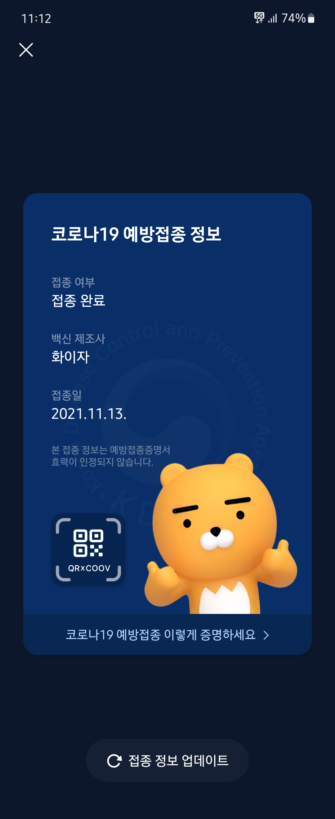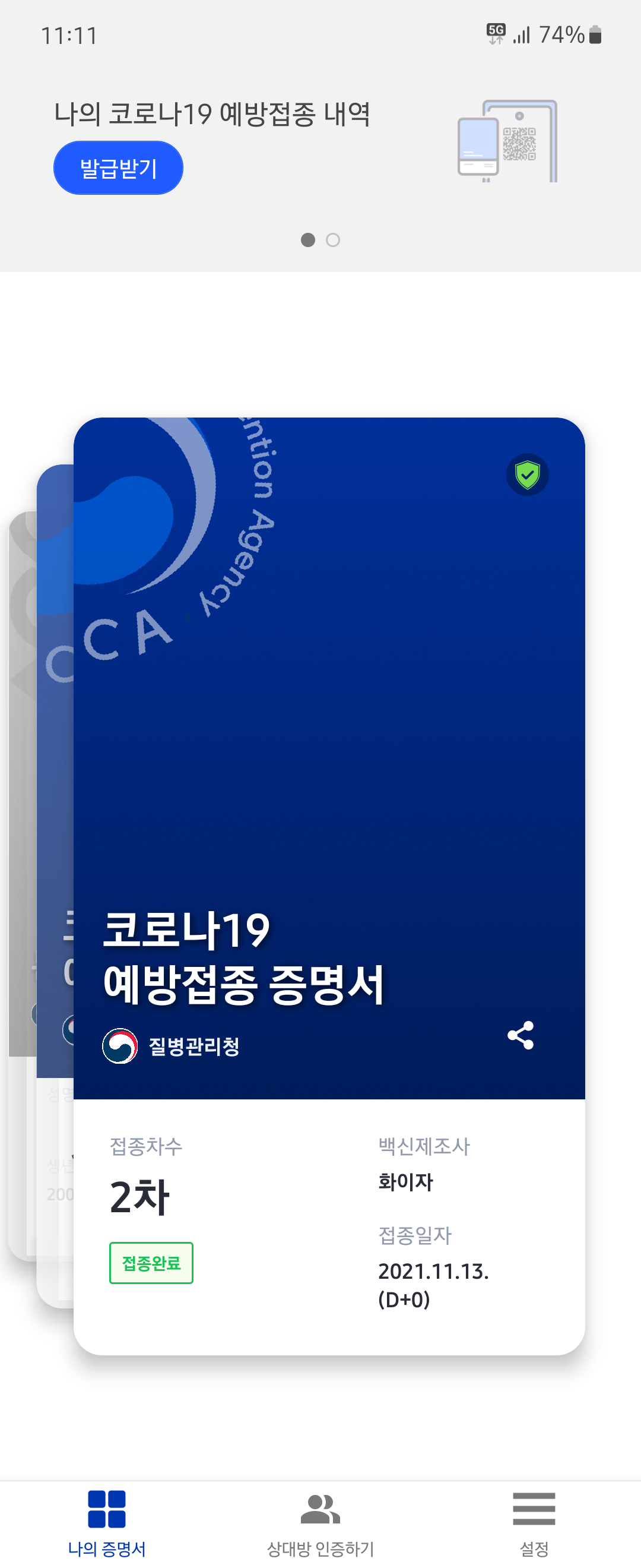 증명서를 보니 14일도 안 지났는데 벌써 접종완료가 붙어있네요