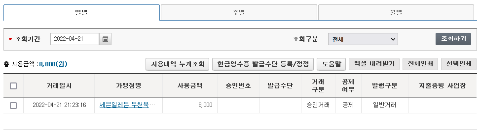 조회기간에 날짜를 넣어서 조회하면 나오게 됩니다