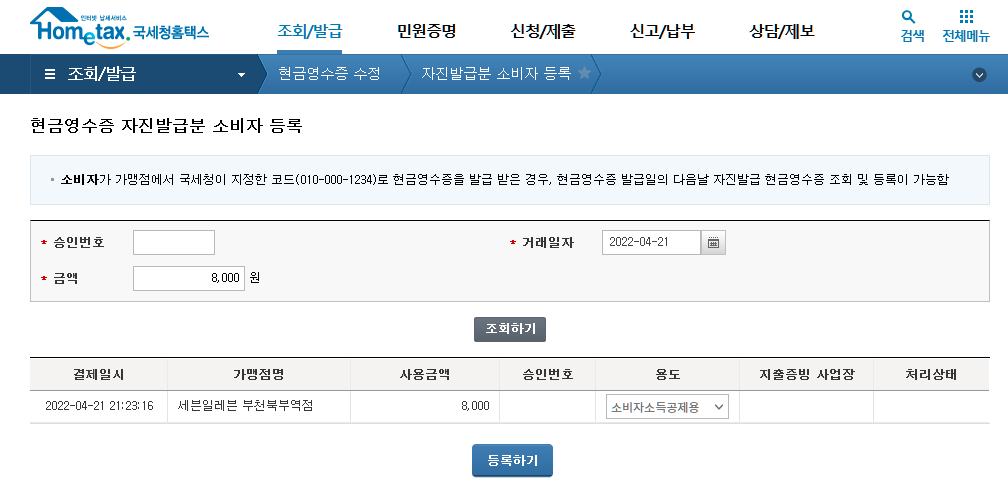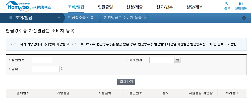 그러면 화면이 나올텐데, '조회/발급' - '현금영수증 수정' - '자진발급분 소비자 등록'에 들어가면
