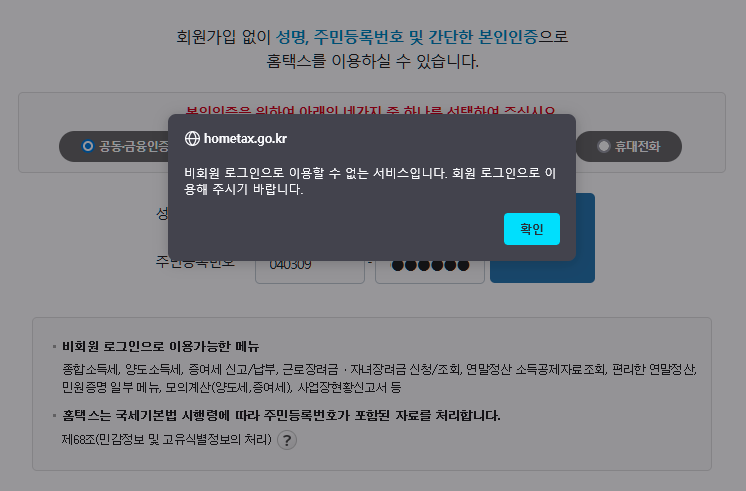 비회원 로그인이 있기는 한데, 로그인 시도를 해보면 이렇게 나옵니다