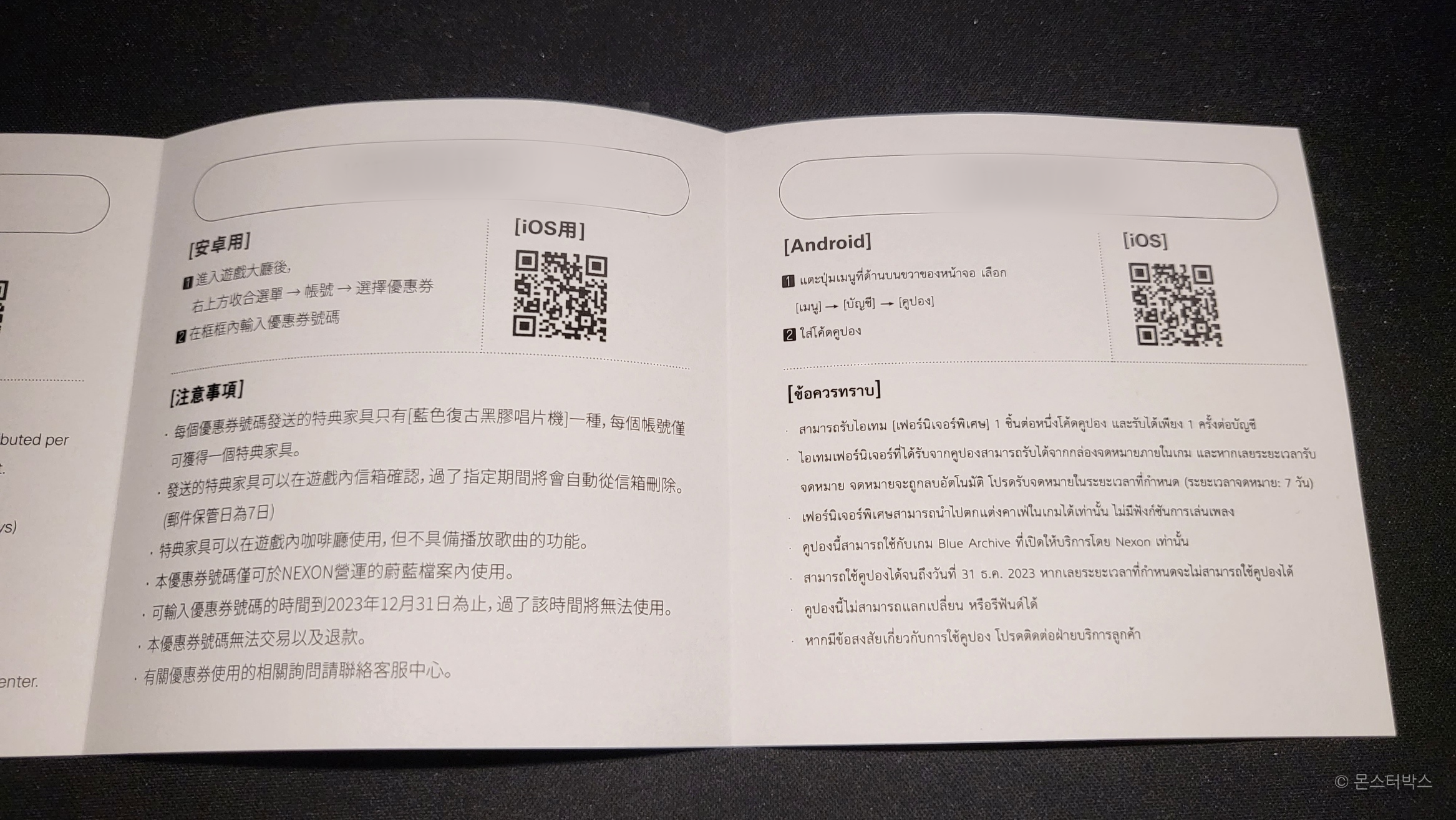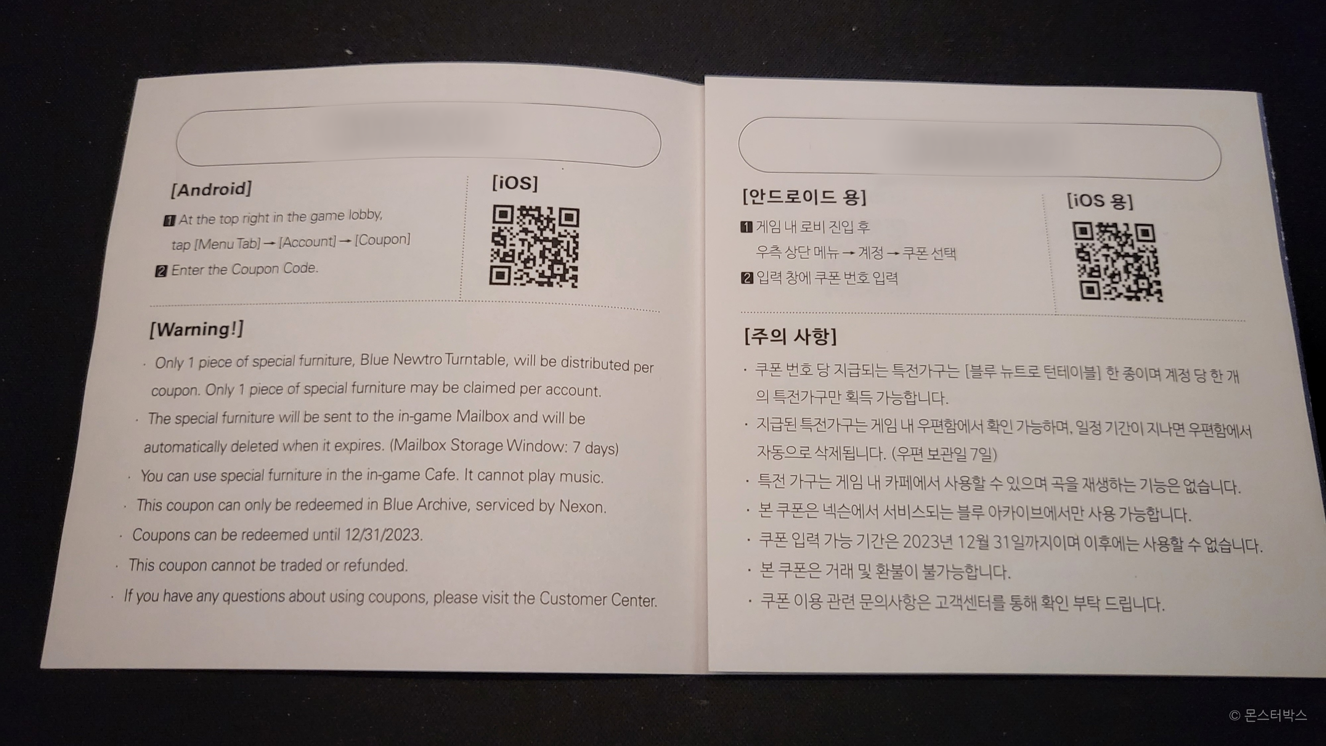 안쪽에는 쿠폰 코드와 사용법이 적혀있는데