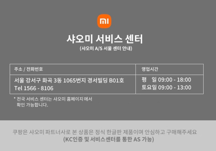 제가 구매한 쿠팡에서는 샤오미 서비스 센터가 화곡에 있다고 안내하고 있는데요