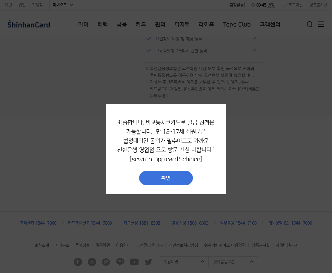 미성년자가 신한카드 광역알뜰교통카드 S20 체크를 신청했을때 나오는 화면