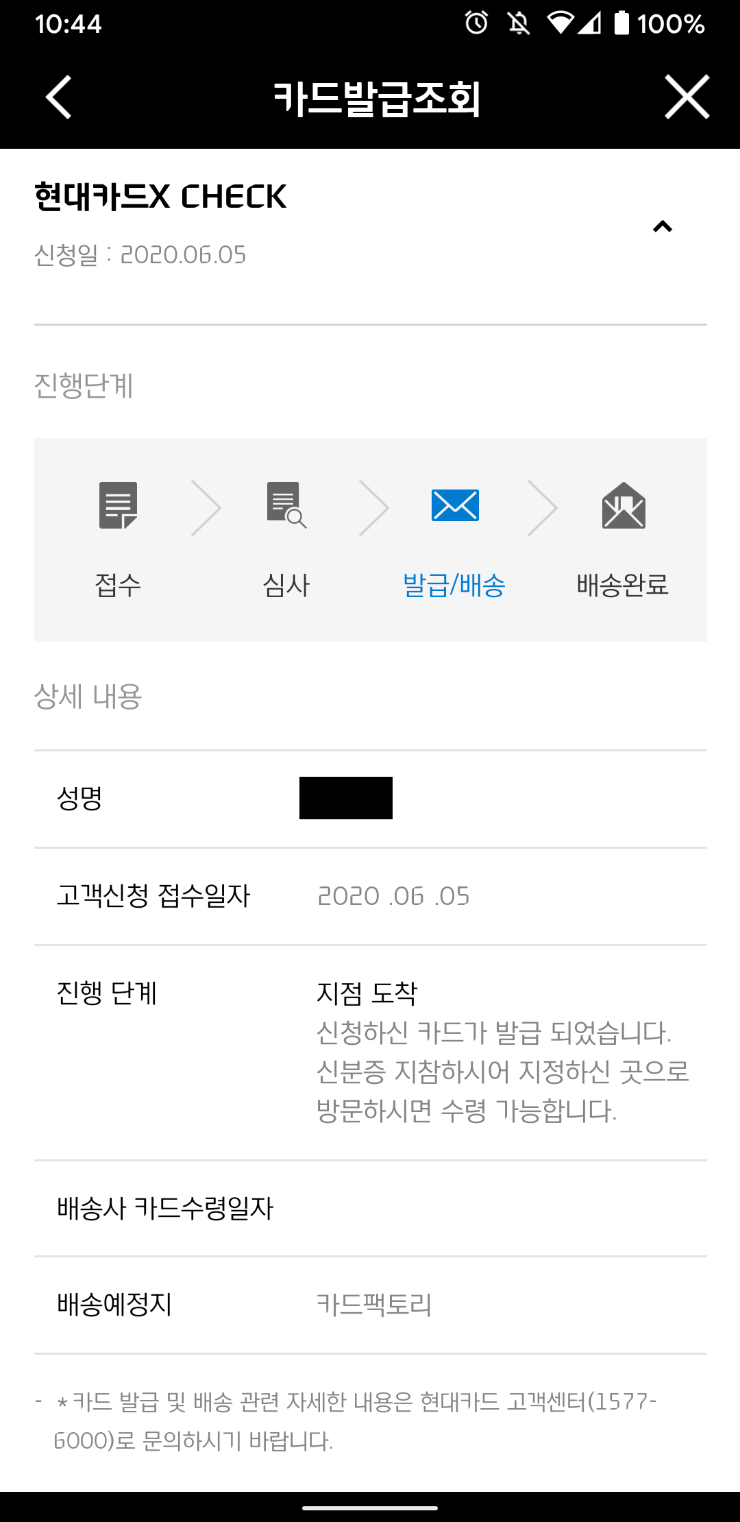발급 조회에는 지점 도착이라고 나옵니다.