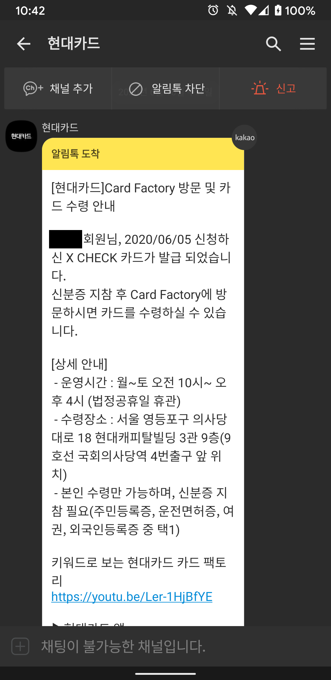 그 후 발급이 완료되면 여의도에 있는 현대카드 카드팩토리로 가서 받으면 됩니다.
