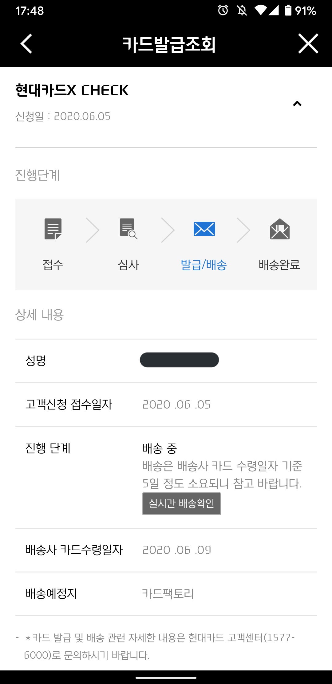 카드팩토리 수령 문자가 오면 가서 수령이 가능하다고 합니다. 내일쯤이면 올 듯
