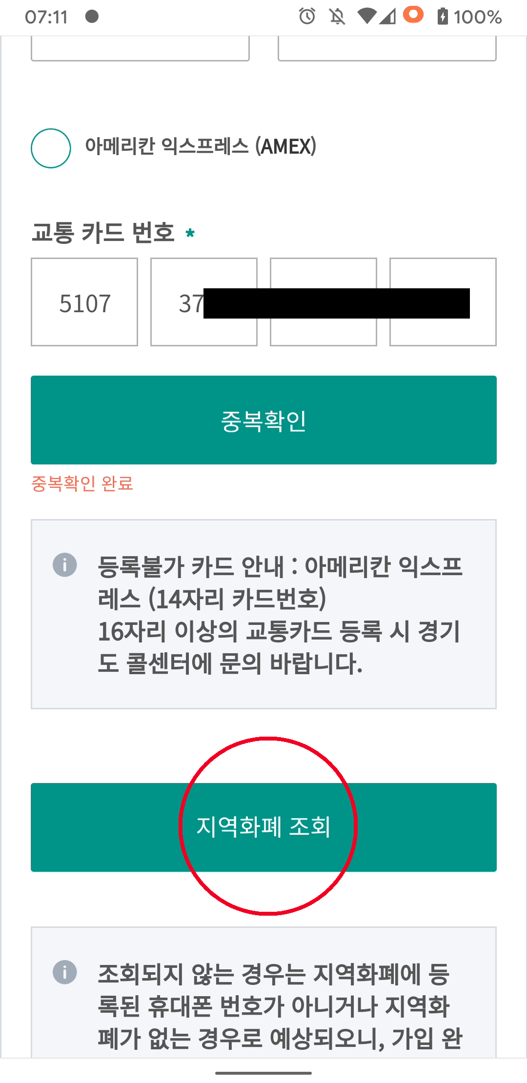 이때 교통카드 번호를 입력해야 하는데, 선/후불 교통카드 모두 등록이 가능합니다.