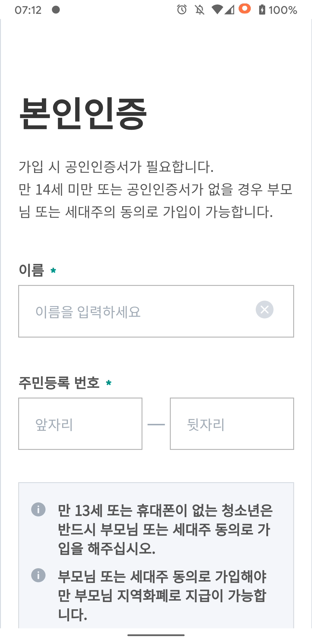 만약 공인인증서가 없거나 만 13세(지역화폐 발급 불가)라면 부모/세대주 명의로 받을 수 있습니다.