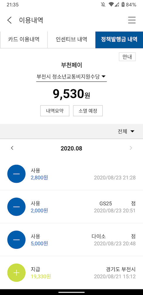 정책발행금으로 분류되고, 사용을 해보니 지원금 먼저 나가네요.