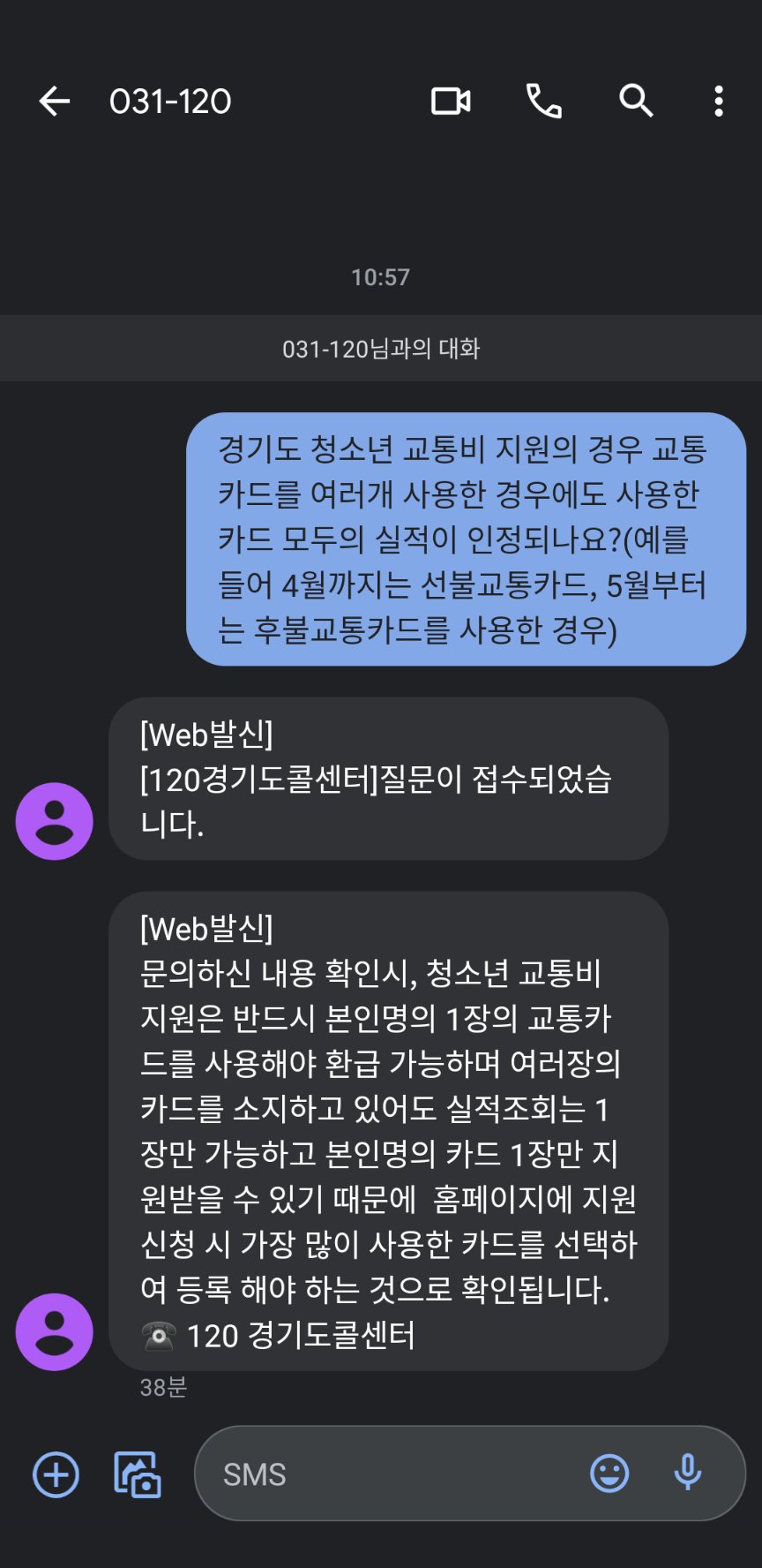 당연하지만 '경기도' 청소년 교통비 지원이기 때문에 경기버스 이용 실적만 인정됩니다.