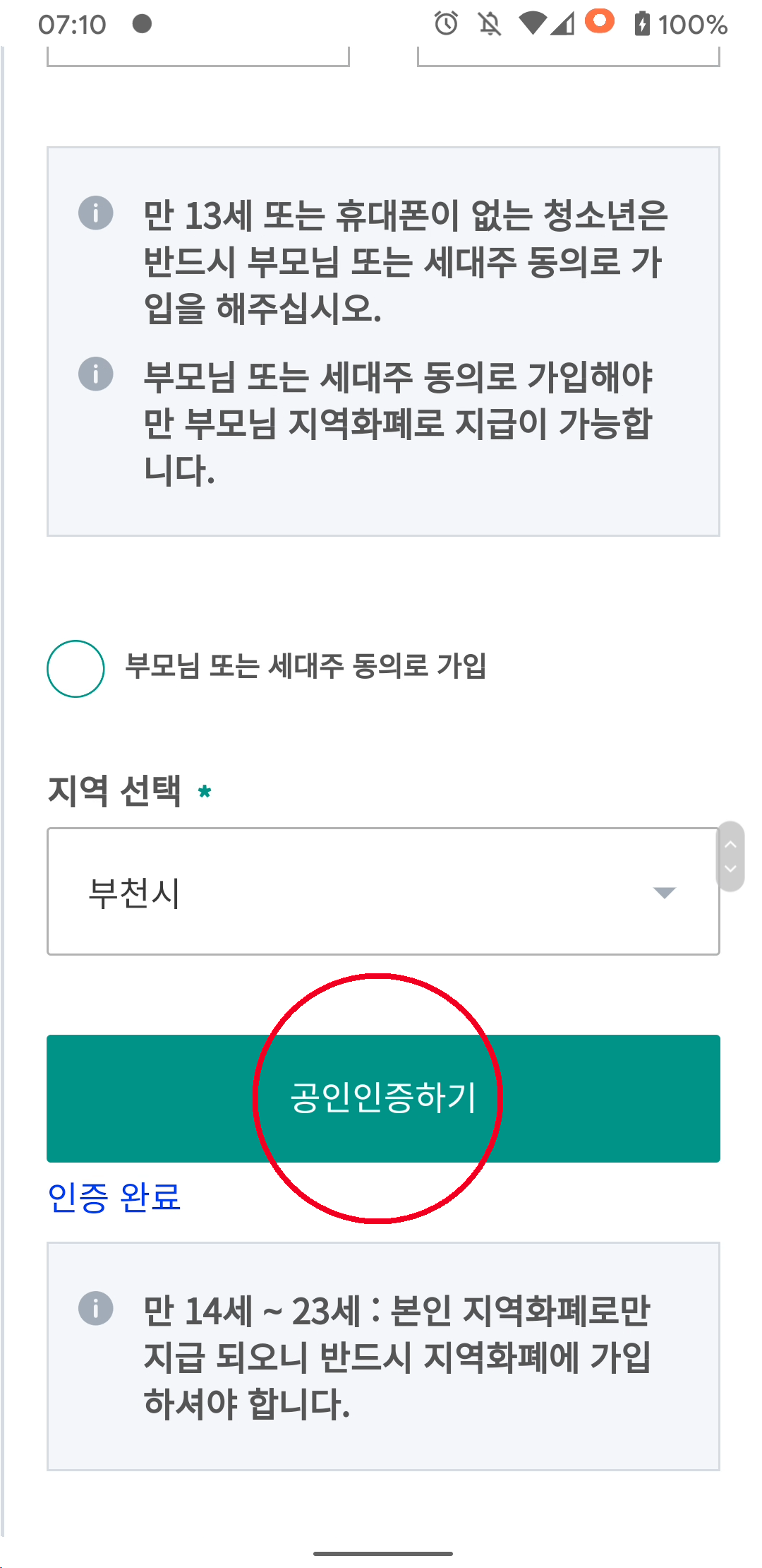 만약 공인인증서가 없거나 만 13세(지역화폐 발급 불가)라면 부모/세대주 명의로 받을 수 있습니다.