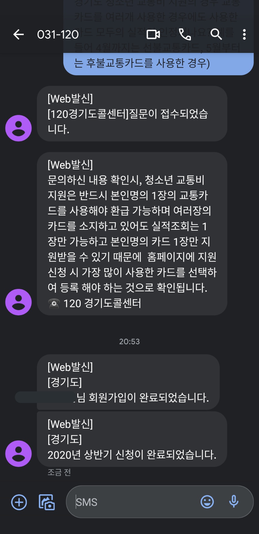 그리고 좀 지나면 신청 완료 문자가 오는데, 031-120으로 문자를 보내주네요;;
