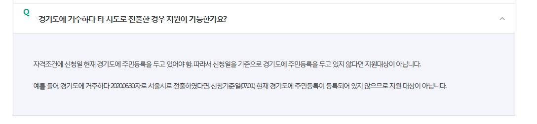 경기도에 거주하다가 타시도로 전출한 경우는 지원을 받을 수 없습니다.