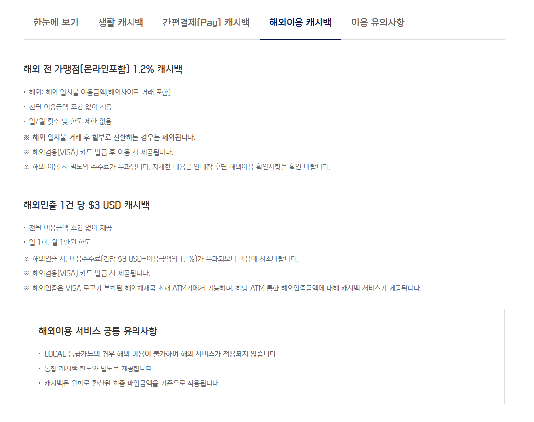 해외 캐시백도 있는데, 결제 1.2%, 인출 $3 캐시백입니다.