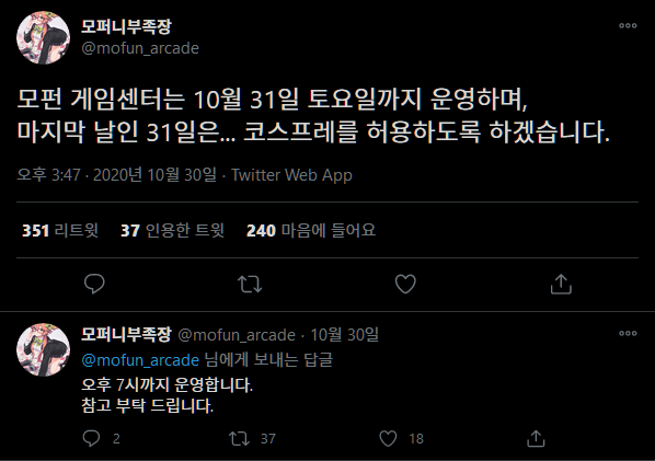 9월 24일, 모펀을 10월 30일까지만 운영한다는 트윗이 올라왔습니다.