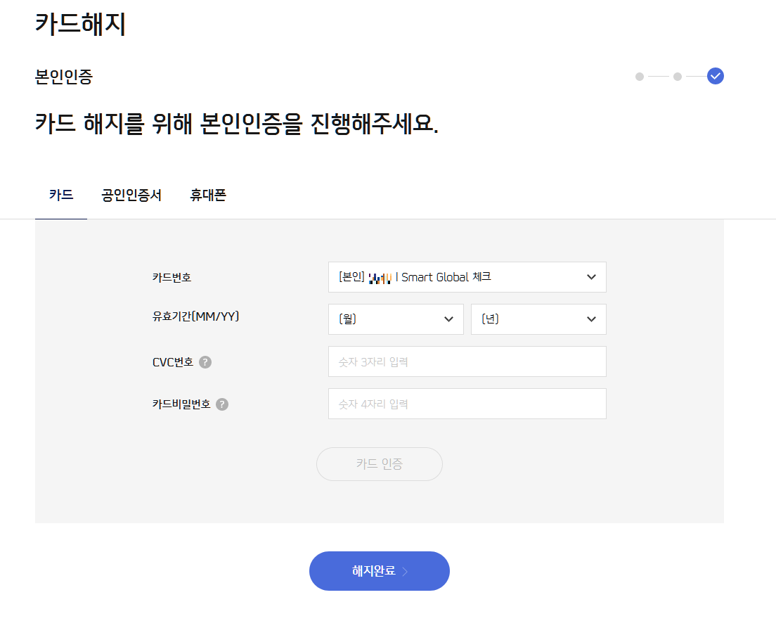 마지막으로 본인인증을 진행하고 아래의 해지완료 버튼을 누르면