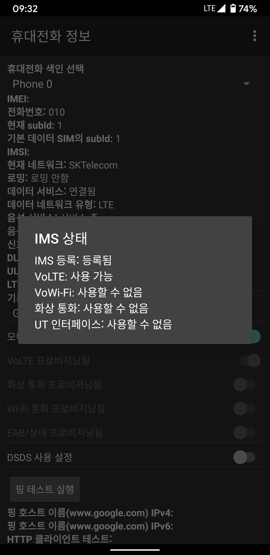 여기서 휴대전화 정보를 누르고, 우측 상단 메뉴에서 IMS 상태를 누르면 현재 상태가 나오게 됩니다.