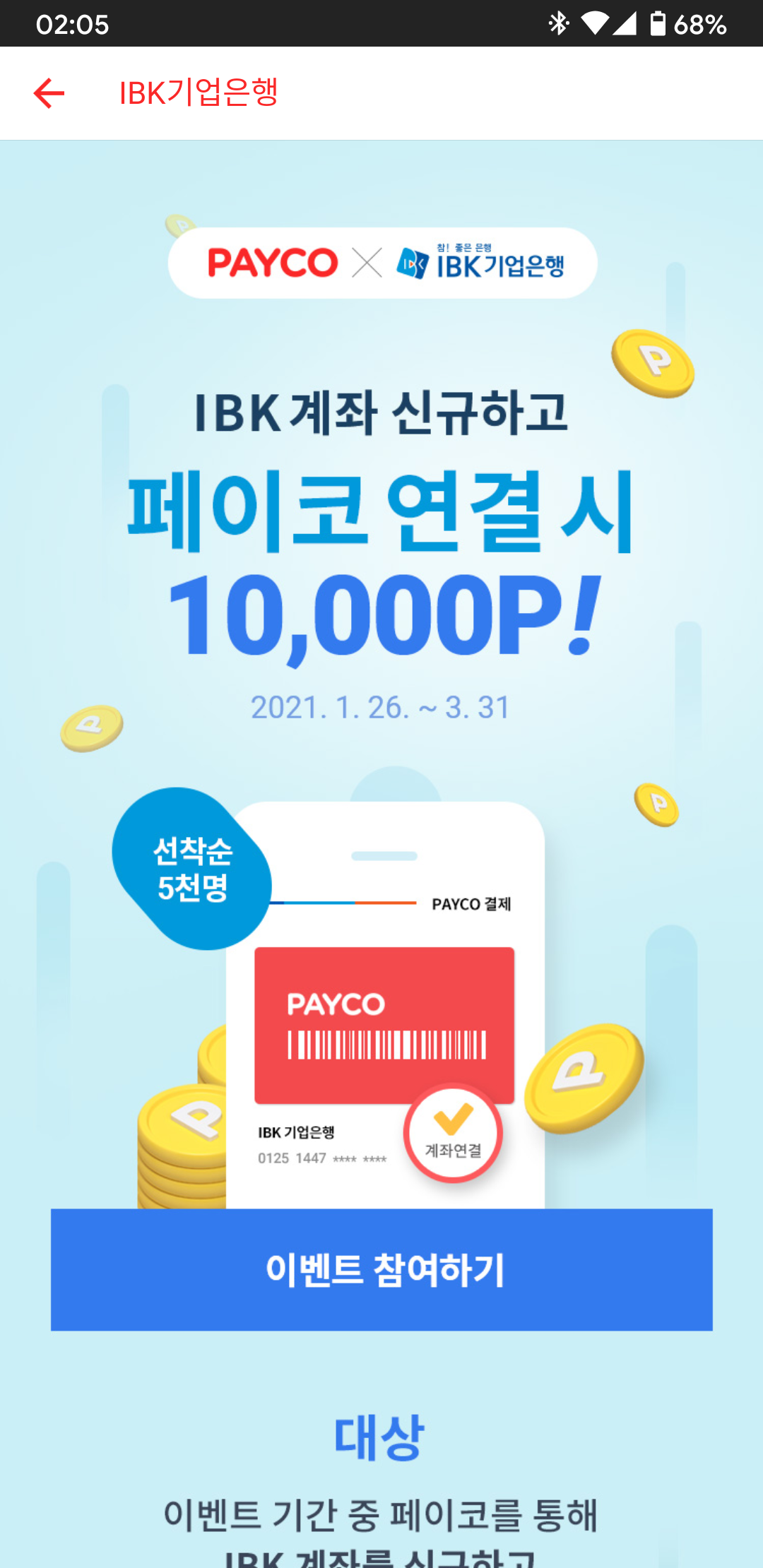 그리고 페이코를 통해 기업은행 계좌까지 만들었습니다.