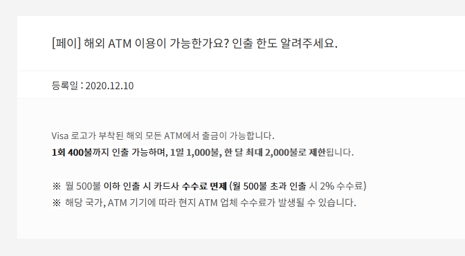 그 이상을 넘으면 2%인데, 국제브랜드 수수료+3달러씩 받아가는 일반 신용/체크카드에 비해 이득이긴 하네요.