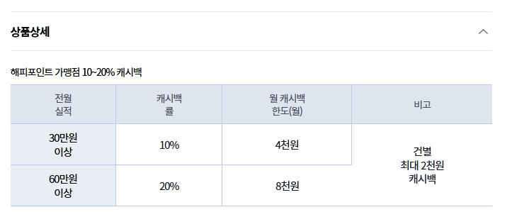 혜택의 경우 카드 이름에 맞게 해피포인트 가맹점에서 캐시백을 해줍니다.
