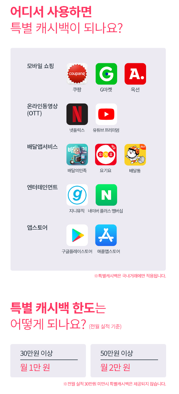전월실적 30만원 이상일 때 특정 가맹점에서 결제시 3% 적립이라고 하네요.