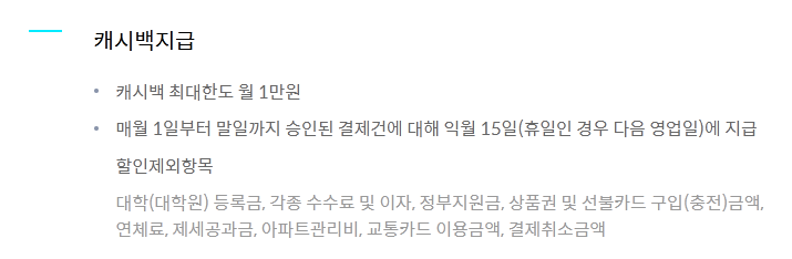 캐시백 한도는 월 1만원이기에 2% 기준 월 50만원까지 캐시백이 됩니다.